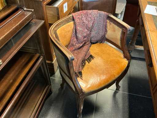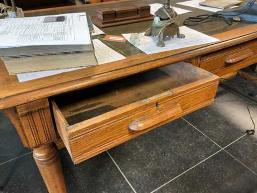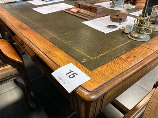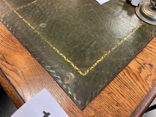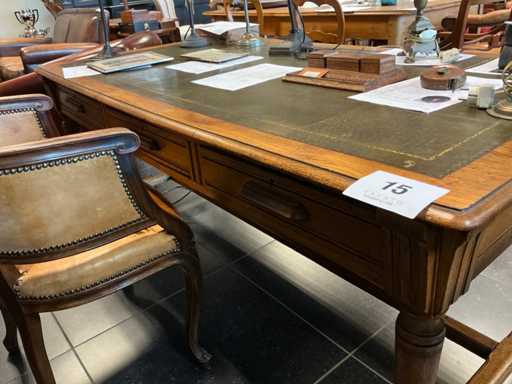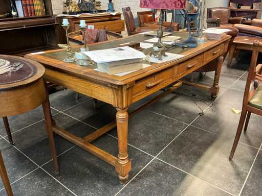 Desk equipped with leather desktop and wooden base and 3x sliding drawer.