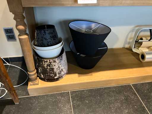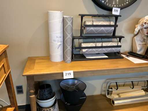 Consisting of wooden shop cabinet with duo roll with wrapping paper, approximately 6x lampshade, +tripod with wrapping paper + 3 separate rolls, DOLLS NOT INCLUDED !!