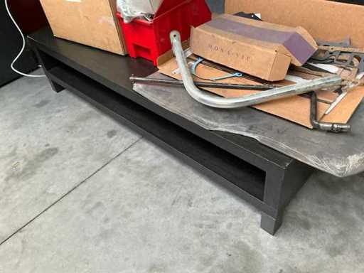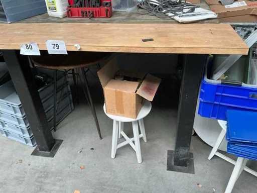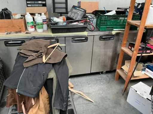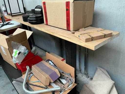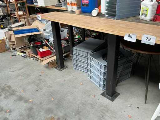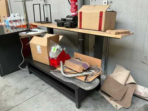 Consisting of 1x table, not mobile, with dimensions approx. 267 x 40 x 100cm, 1x mobile table with dimensions approx. 240 x 124 x 100cm, 1x mobile table with storage shelf with dimensions approx. 230 x 36 x 96cm and 1x defective refrigerated workbench with dimensions approx. 210 x 70 x 90cm. All without content.