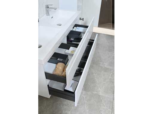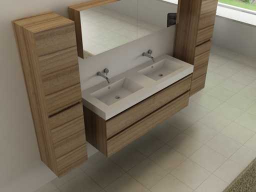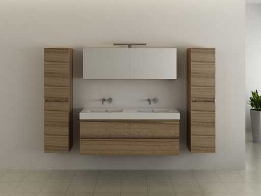 Type : Épercier. Modèle : mobilier de salle de bain pour deux personnes, 120 cm de décoration en bois naturel. Taps : inclus. Dimensions : Ensemble 2 personnes : 1 * Mobilier lavabo - 1200x470x500mm, 2 * Armoires latérales - 1500x350x350mm, 1* Armoire miroir - 1200x450x180mm. Équipé de : Robinets incluant un drain escamotable - Système de tiroirs à fermeture douce - Éviers en résine - Armoires latérales préassemblées et meubles de lavabo.