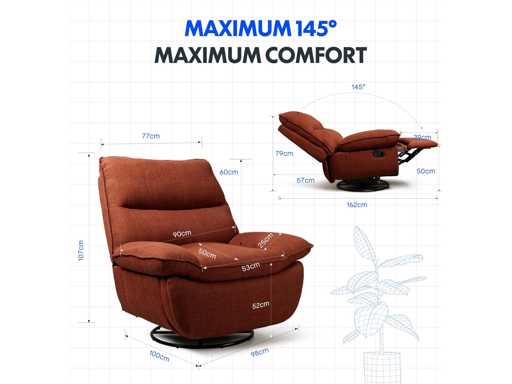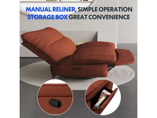 Marque FLEXISPOT Couleur Orange Marron Matériau Tissu Dimensions du produit 100P x 98l x 107H centimètres Taille XC6 Manuel Poids de l'article 48 Kilogrammes Style arrière Dossier continu Matériau du cadre Fer Caractéristique spéciale Accoudoir, Hauteur réglable, Pivot, Roulement, Support lombaire réglable Instructions d'entretien Entretien général : Voir plus À propos de cet article DESIGN ERGONOMIQUE : Équipé d’un siège spacieux, notre fauteuil inclinable offre un soutien ergonomique qui s’adapte à différentes positions assises, que vous soyez debout, couché sur le côté ou que vous croisiez les jambes. De larges accoudoirs et un rembourrage épais assurent un soutien supplémentaire des bras et des épaules pour un confort ultime. PIVOTAGE STABLE : Le piètement robuste du fauteuil garantit un soutien stable pour les mouvements de pivotement et de basculement. Notre fauteuil inclinable pivote silencieusement. Alors, lorsque vous êtes fatigué, fermez les yeux, libérez complètement votre stress et laissez-vous profiter d'un moment de paix et de tranquillité. La conception flexible convient non seulement aux mères pour passer du temps précieux avec leurs bébés, mais aussi aux personnes âgées pour dormir paisiblement.