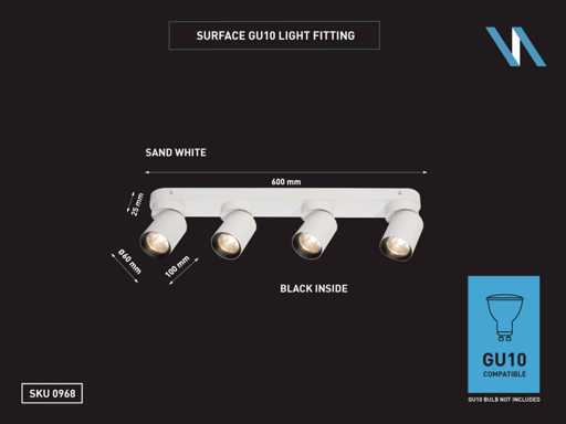 Scellement IP20, couleur du produit blanc et noir, tamisé. Ø 60 x 100mm, dimensions support mural 600 x 60 x 25mm, rotatif de 350° et inclinable de 50°, matériau aluminium et fer, montage inclus, installation GU10, ampoule non incluse, adapté à l’intérieur, entrée de 4 ampoules, tension 220-240V, puissance max 40 watts, SKU 00968