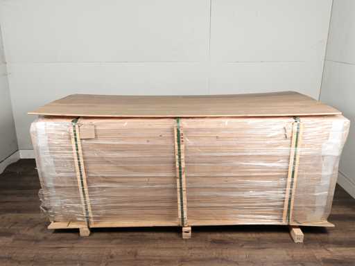 Facile à poser grâce au système à rainures langette, adapté à tous types de chauffages de sol et de climatisation, parquet de qualité ; la couche supérieure est en bois de chêne, traitement prêt à l’emploi, épaisseur 14 mm, couche supérieure 3 mm, notez que certaines parties de parquet sont envahies, 53 paquets de 2 376 m2