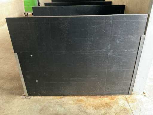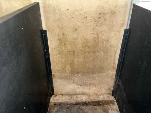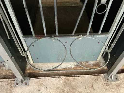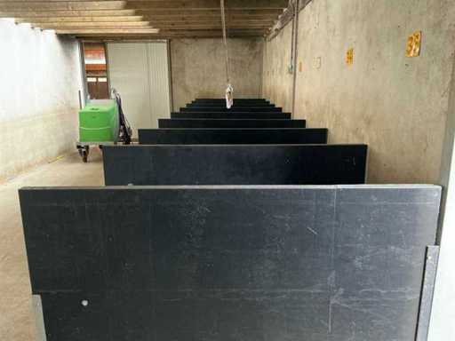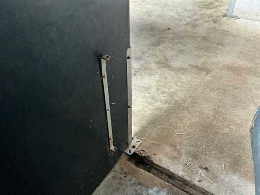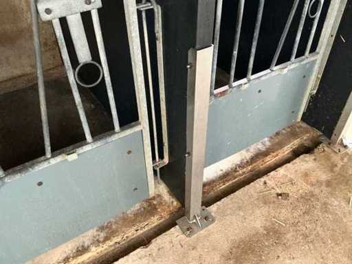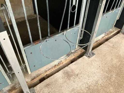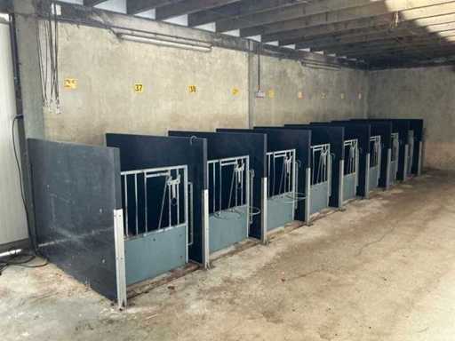 Comprend : un ensemble complet de 18 jardinières individuelles, 18 cloisons en plastique, 18 profils en U en acier inoxydable, dimensions internes par caisse, largeur : 890 mm, longueur : 1 500 mm, hauteur : 1 250 mm, cloisons en plastique : 1 700 x 1 250 x 50 mm, montées avec profil en U plastique contre le mur, façade équipée de profils en U en acier inoxydable avec base, porte galvanisée, verrouillable en bas avec plaque en plastique, incluant des porte-cloches métalliques pour les seaux d’alimentation/boisson (2 anneaux par boîte), Conception solide et hygiénique : 18 pièces, longueur totale incluant les cloisons (pour 9 pièces) : environ 8 410 mm, concerne 2 montages de 9 pièces, seront démontées professionnellement par le vendeur, prêtes à être chargées et transportées.