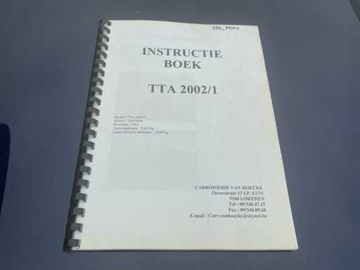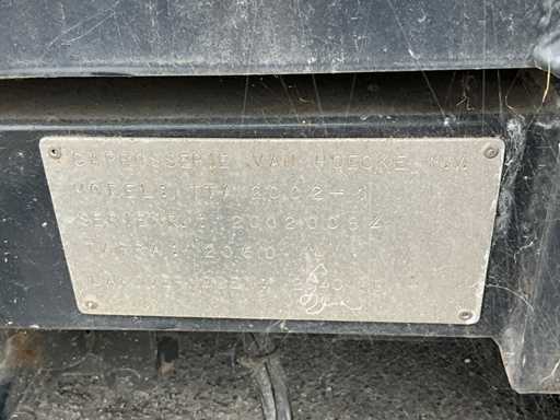 Données de la remorque : Carrosserie Van Hoecke type TTA 2002-1. Numéro de châssis : 20020084. Poids à vide 2060kg. PTAC : 2940kg. Remorque sans documents !