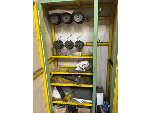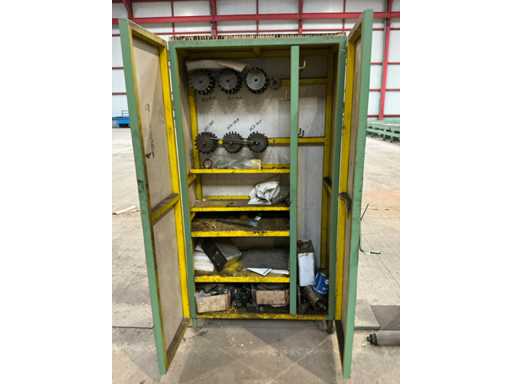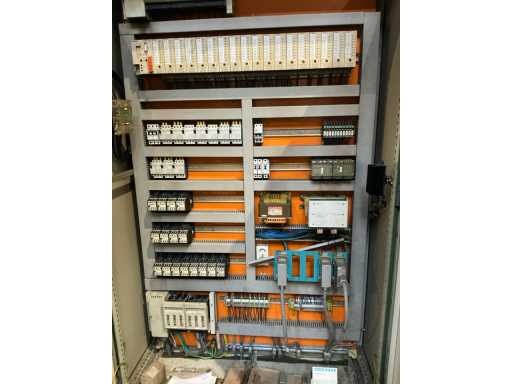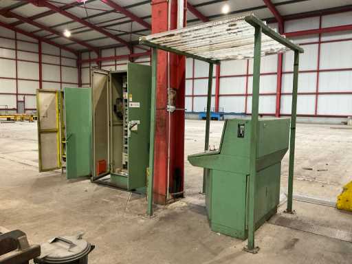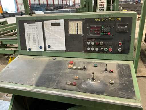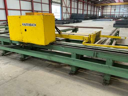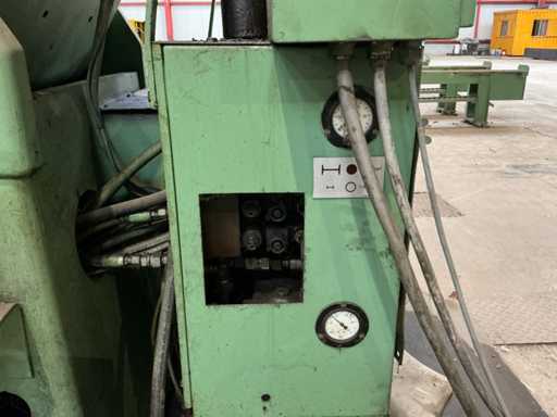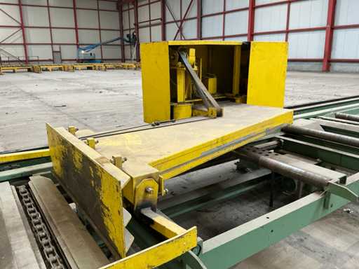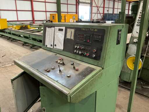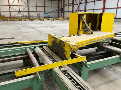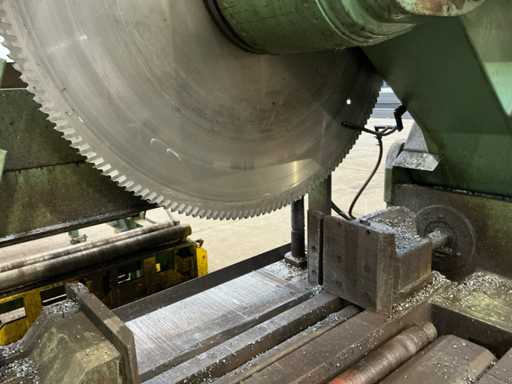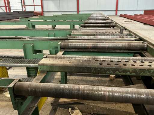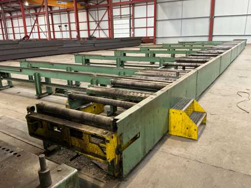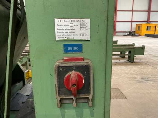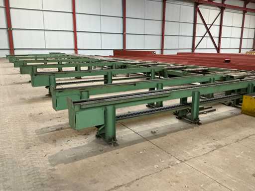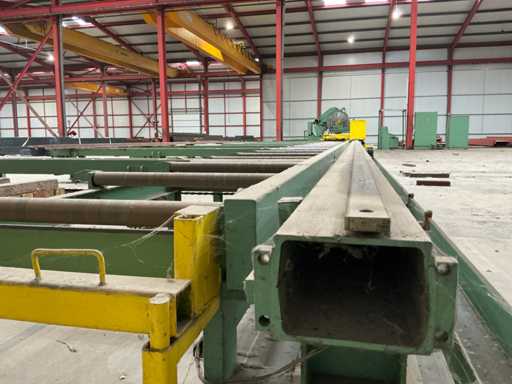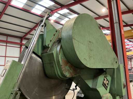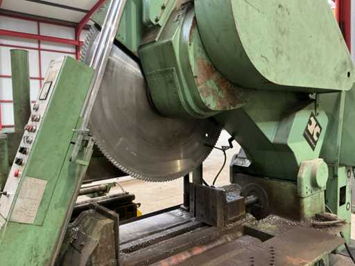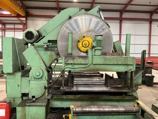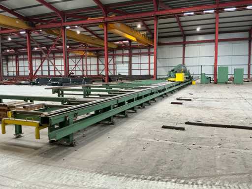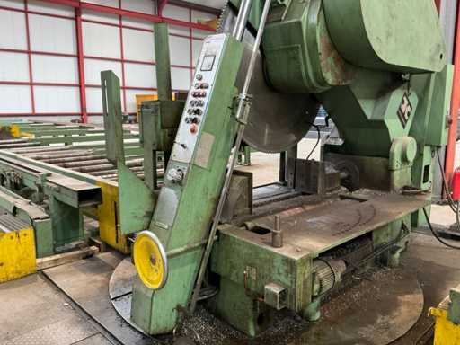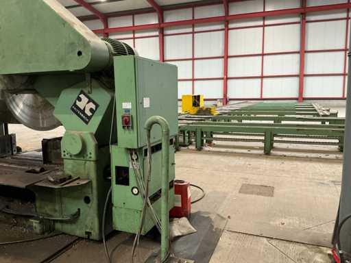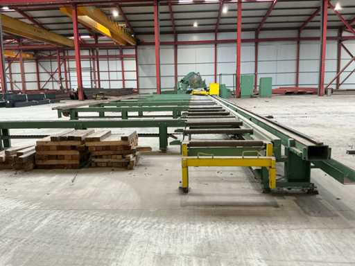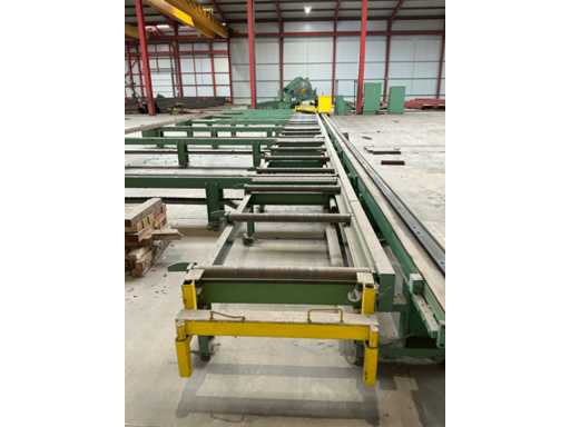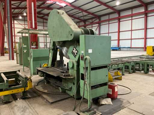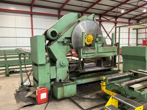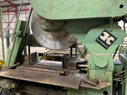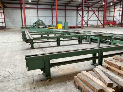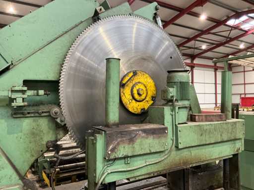 Scie circulaire en parfait état de fonctionnement. Chariot doseur en parfait état de fonctionnement. 1 lame de scie de rechange. Plus moins 50 mètres de pistes à roulettes. Poutre en acier Max HEM 1000. Alimentation et décharge automatiques. Chemin à rouleaux de 5 mètres de large. Scie à onglets à 45 degrés. Partiellement démonté. Pont roulant disponible.