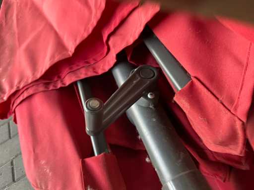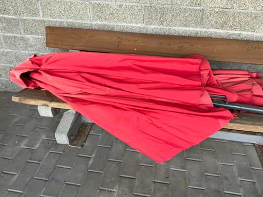 Parasol d’environ 300 cm de diamètre équipé d’un support en plastique et complet avec 2 pieds métalliques différents.