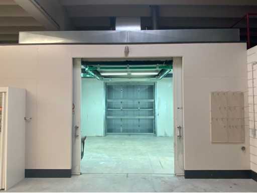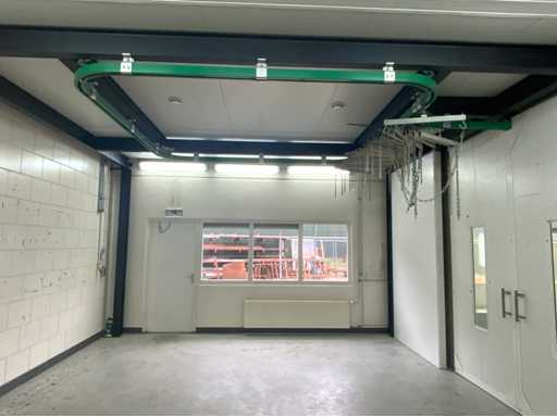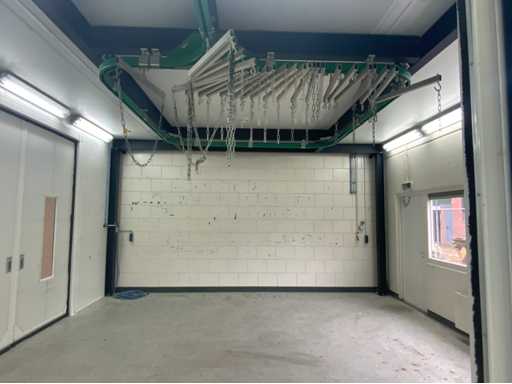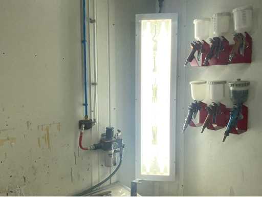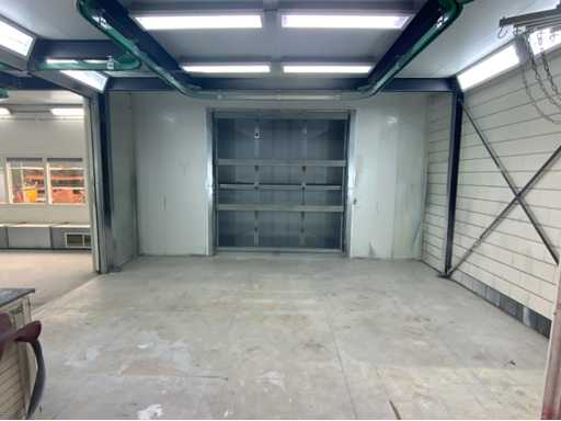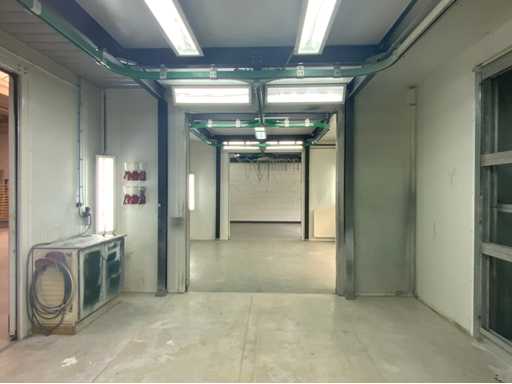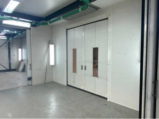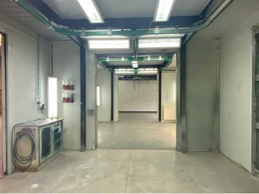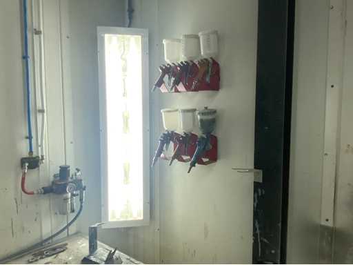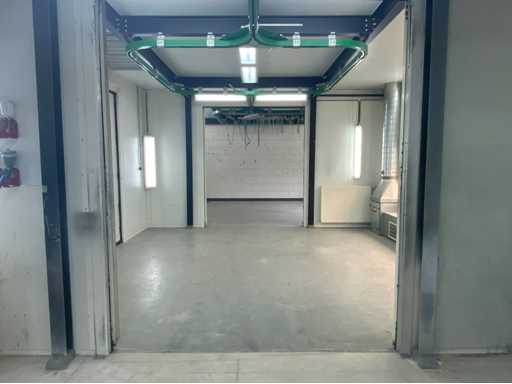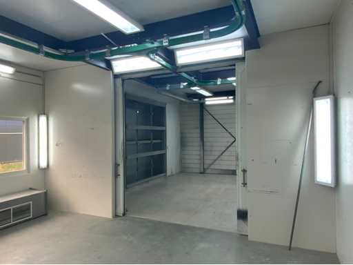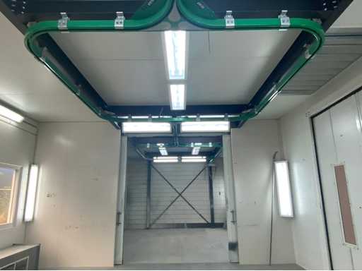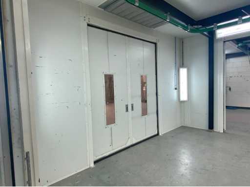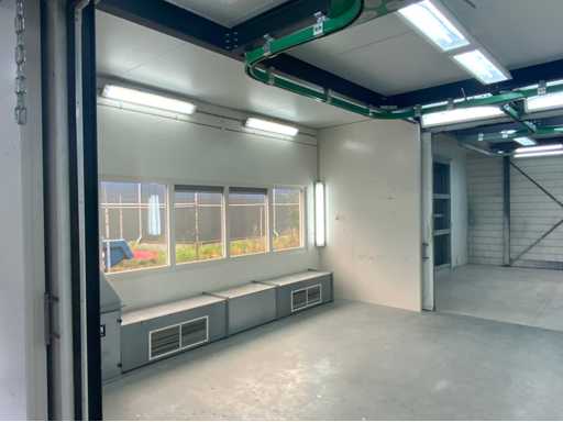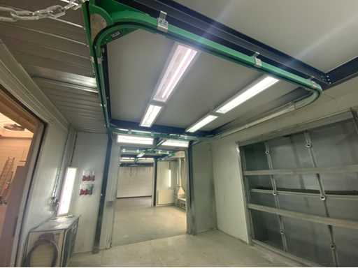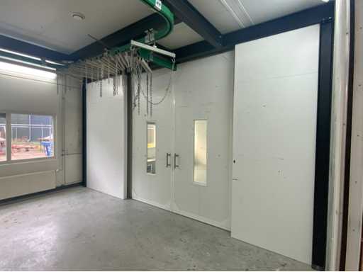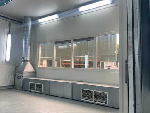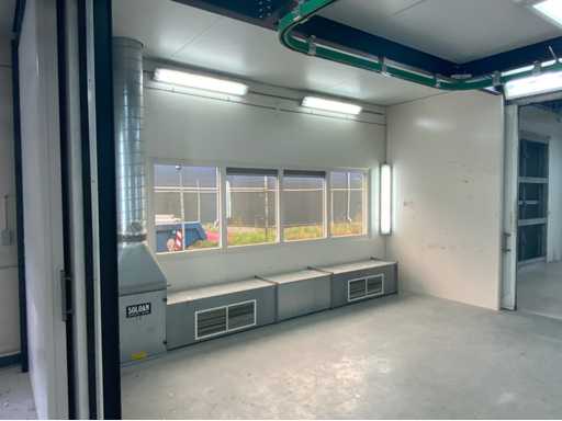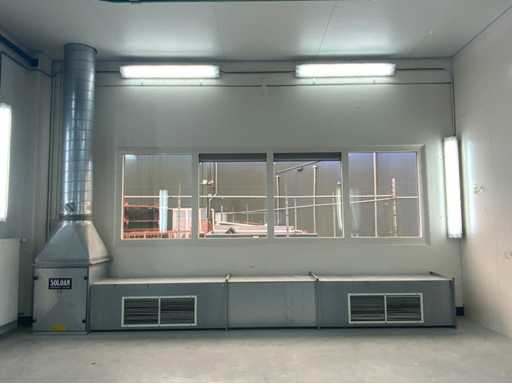 Salle de pulvérisation préfabriquée avec 2 salles de séchage connectées. Composé d’une construction en acier avec des panneaux en tôle d’acier (50 mm remplis de laine de roche). Parois avant et cloisons avec portes coulissantes (247x296cm) La paroi arrière et les parois latérales sont des options de construction et restent derrière. Soloan 1032 Mur d’extraction 300x314cm, unité d’alimentation en air/chauffage 110Kw à gaz, extraction de vapeur dans la salle de séchage intermédiaire, extraction de vapeur Soloan DDE séparée pour l’espace de préparation de la peinture, la salle est équipée d’un système de rails Soloan S7 avec 35 chariots à poutres de cadre (charge maximale 250kg par rouleau). Beaucoup d’éclairage partout (protégé IP54). Tous les canaux d’alimentation et de drainage appartiennent au lot, à l’exception des pénétrations du toit. Équipé d’un panneau de commande TR-SD, d’une section de préfiltre/vanne de type K600 (nécessaire pour la pulvérisation à base d’eau) équipé du système d’extraction de vapeur Soloan S4000.