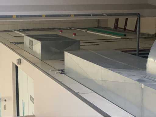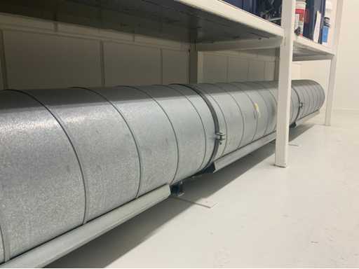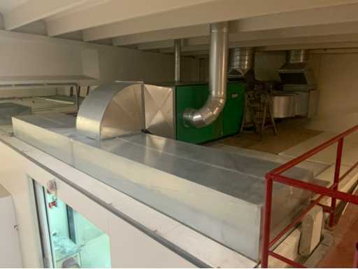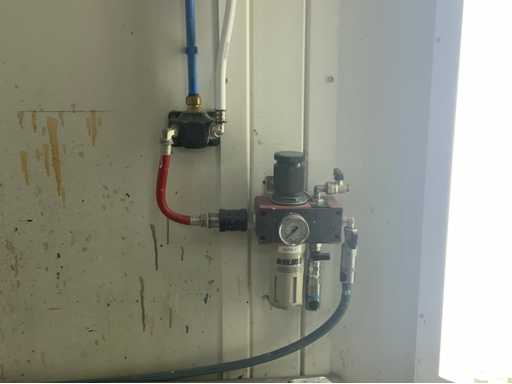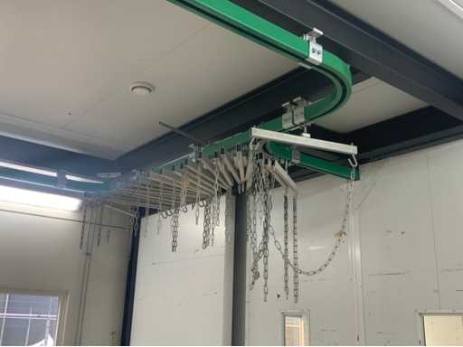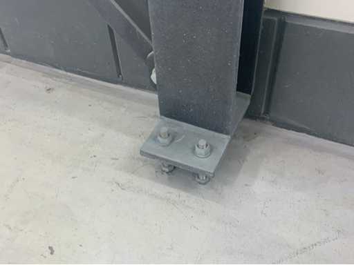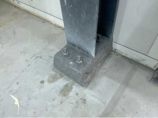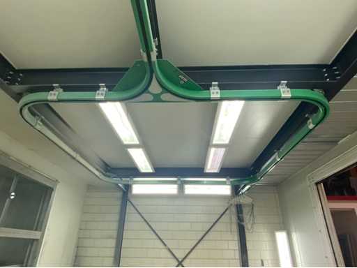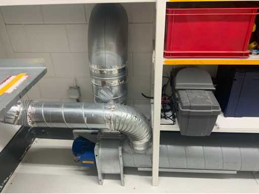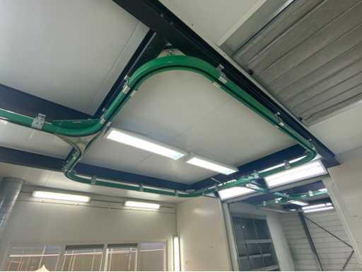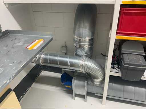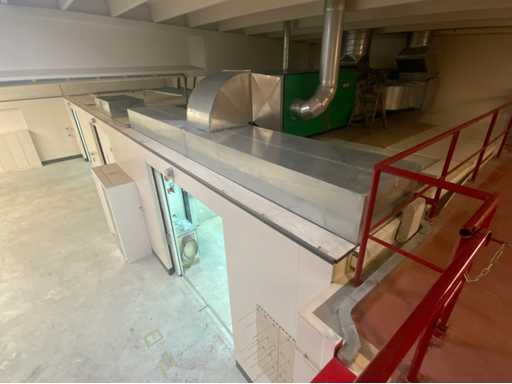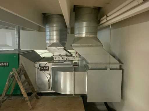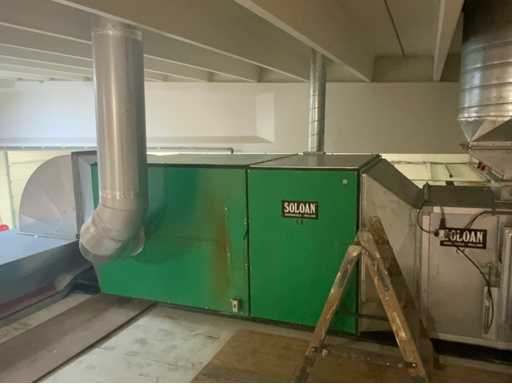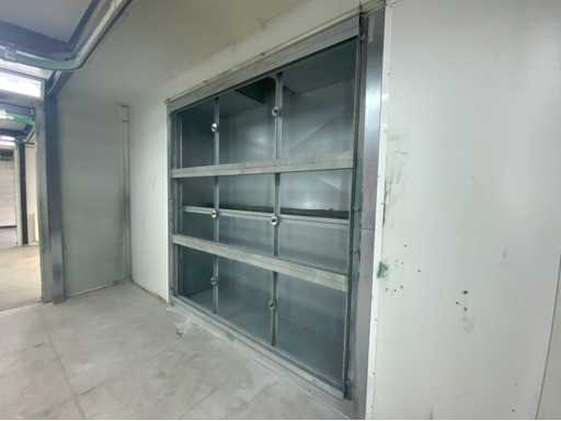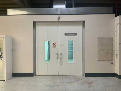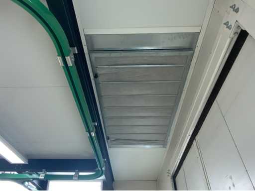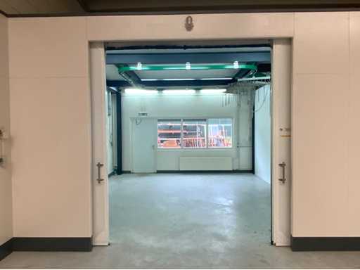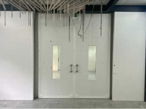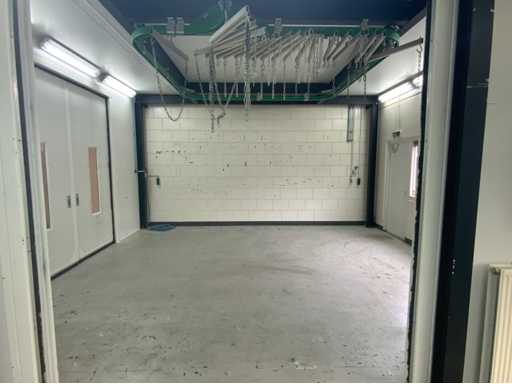 Salle de pulvérisation préfabriquée avec 2 salles de séchage connectées. Composé d’une construction en acier avec des panneaux en tôle d’acier (50 mm remplis de laine de roche). Parois avant et cloisons avec portes coulissantes (247x296cm) La paroi arrière et les parois latérales sont des options de construction et restent derrière. Soloan 1032 Mur d’extraction 300x314cm, unité d’alimentation en air/chauffage 110Kw à gaz, extraction de vapeur dans la salle de séchage intermédiaire, extraction de vapeur Soloan DDE séparée pour l’espace de préparation de la peinture, la salle est équipée d’un système de rails Soloan S7 avec 35 chariots à poutres de cadre (charge maximale 250kg par rouleau). Beaucoup d’éclairage partout (protégé IP54). Tous les canaux d’alimentation et de drainage appartiennent au lot, à l’exception des pénétrations du toit. Équipé d’un panneau de commande TR-SD, d’une section de préfiltre/vanne de type K600 (nécessaire pour la pulvérisation à base d’eau) équipé du système d’extraction de vapeur Soloan S4000.
