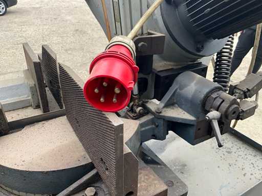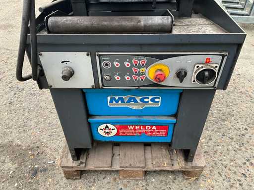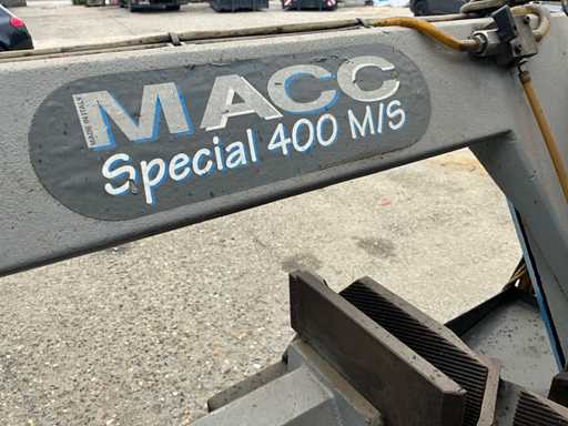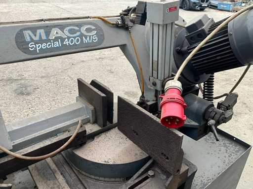Scie à ruban semi-automatique professionnelle Macc Special 400 M/S pour la coupe de profilés en acier, de tuyaux et de matériaux solides. Cette machine robuste (575 kg) est équipée d’une alimentation de scie hydraulique et d’un moteur puissant, permettant un sciage précis et efficace - Capacité de coupe (indicative, type 400) : Matériau rond : jusqu’à environ Ø 330–400 mm ; Matériau carré : jusqu’à environ 330 x 330 mm ; Matériau rectangulaire : jusqu’à environ 400 x 250 mm - cycle de coupe semi-automatique, commande hydraulique, alimentation de la scie réglable en continu, système de refroidissement - Lame de scie : longueur d’environ 4100 mm (largeur 27–34 mm) - 2x240V - le vendeur peut charger