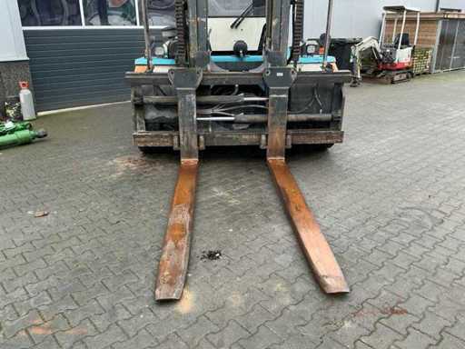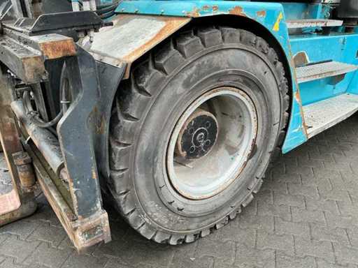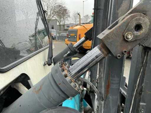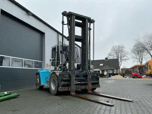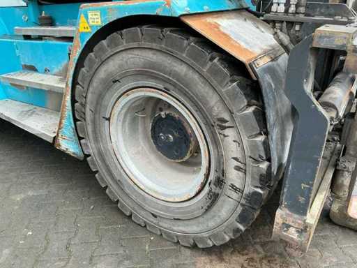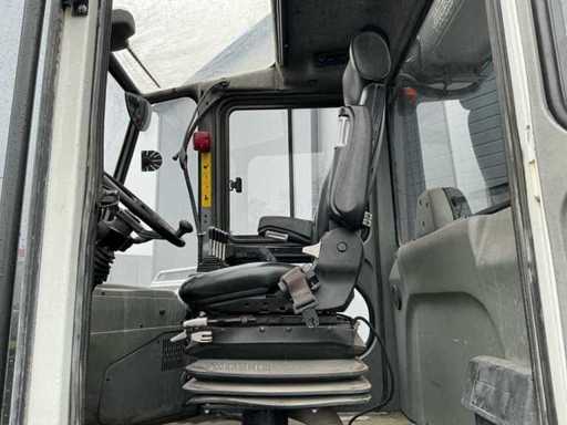 Équipé de : Konecranes SMV 12-600 B, 12 tonnes à 600 mm, empattement 3000 mm, hydraulique à détection de charge, réglage hydraulique de la fourche, levier de vitesses latéral hydraulique, transmission ZF 4WG, moteur Volvo TAD 871, ErgoCab, système maître EMC, chauffage et ventilation de cabine, climatisation, filtre cyclone, éclairage LED, siège pneumatique Grammer, longueur (fourches incluses 2 400 mm) : 7 600 mm, largeur : environ 2 450 – 2 500 mm, hauteur (mât rétracté) : 4 195 mm, poids propre : 15 300 kg.