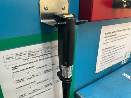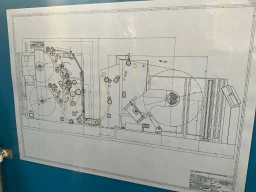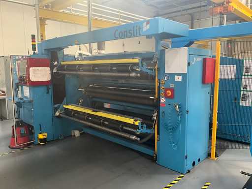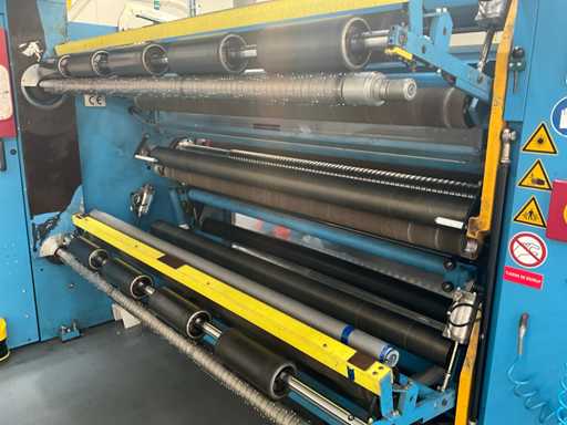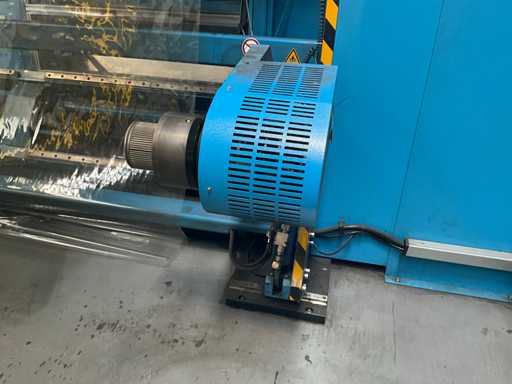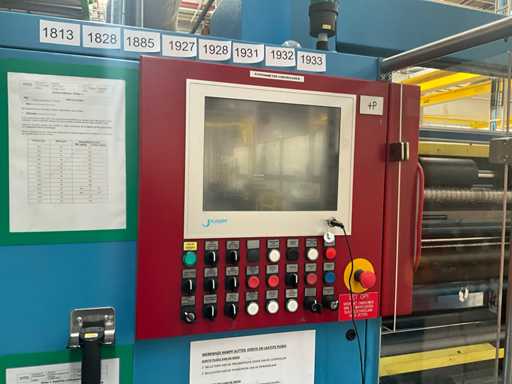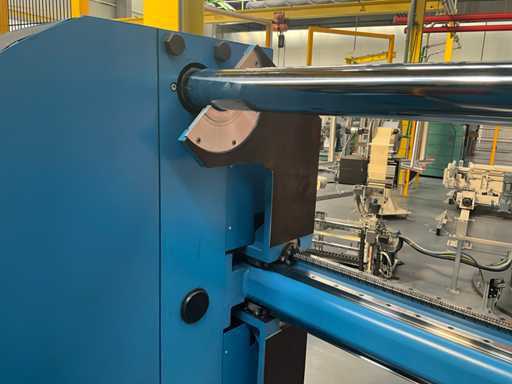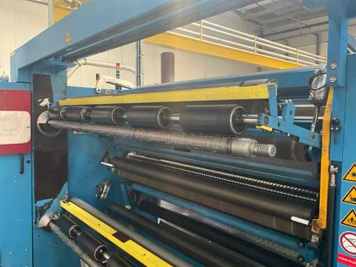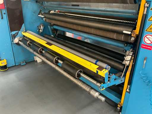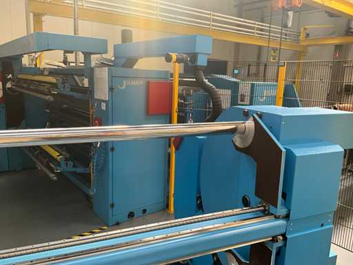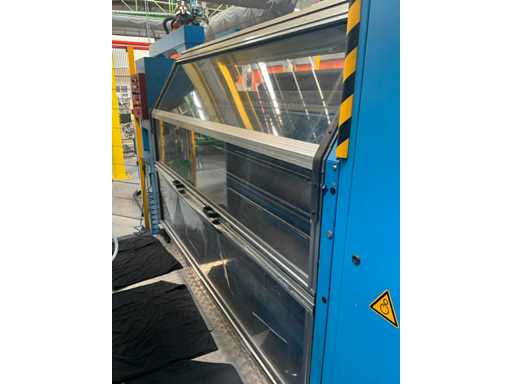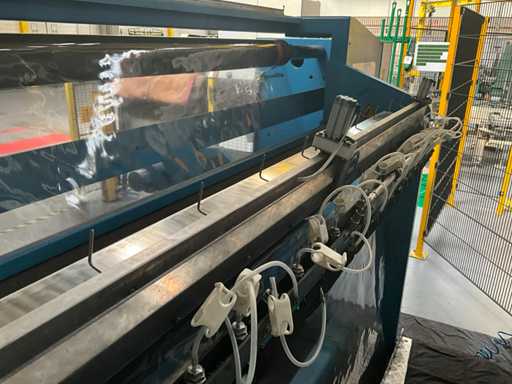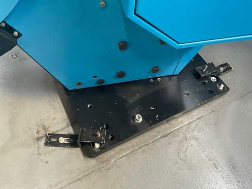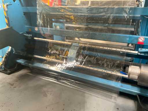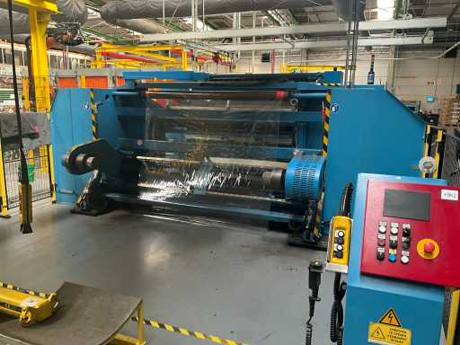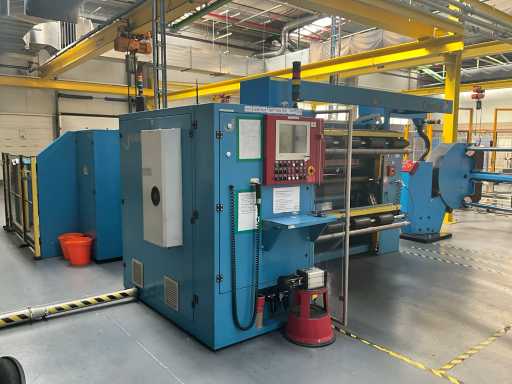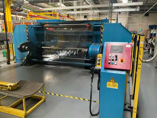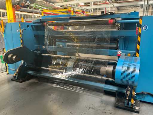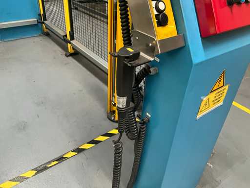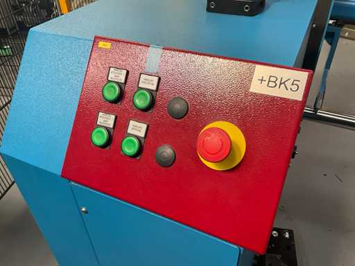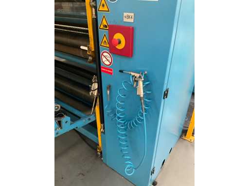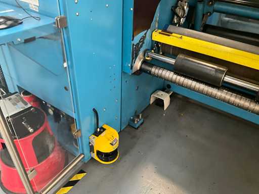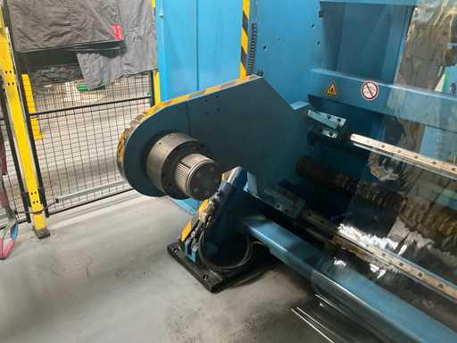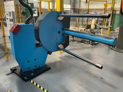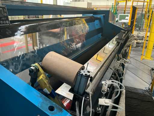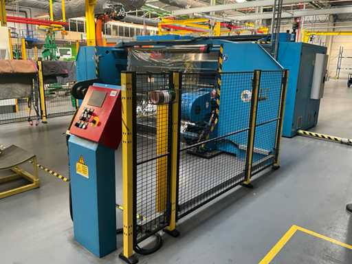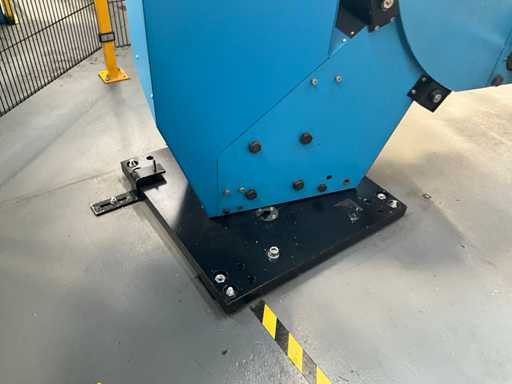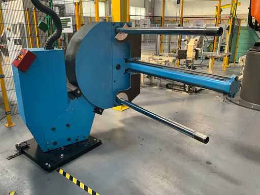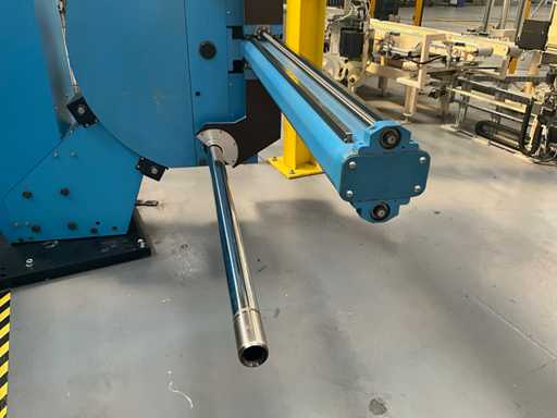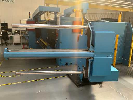 Complet avec module rotatif à 2 bras pour l’alimentation/déchargement des rouleaux (position de repos et fonctionnement horizontal/vertical) équipé d’un panneau de commande +BK5 avec boîte fixe +KK4, sur une base en métal lourd au moyen de boulons dans le sol, taille séparée de la machine environ 200 x 160 cm).