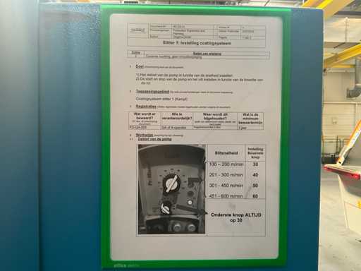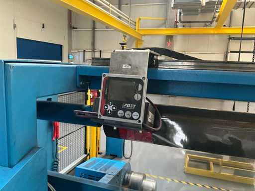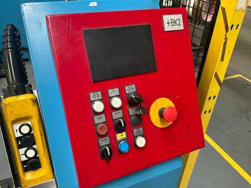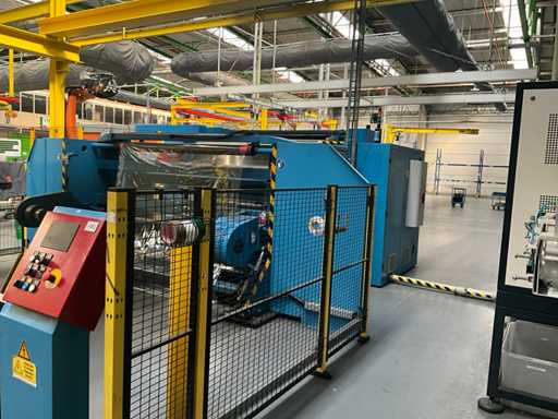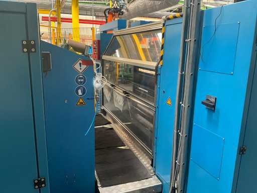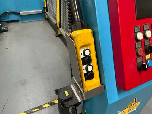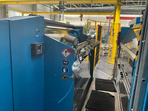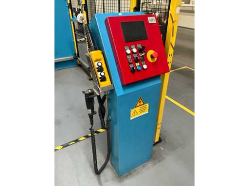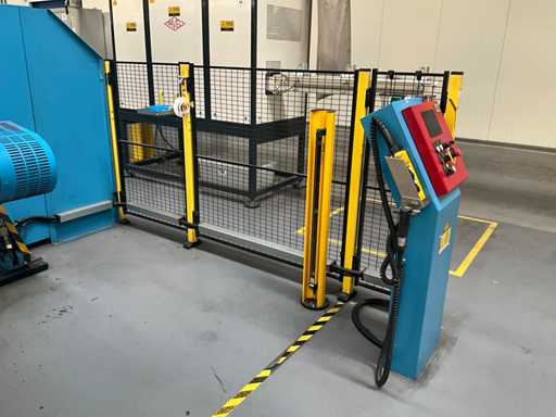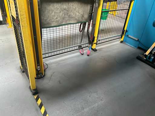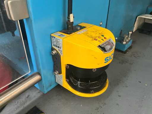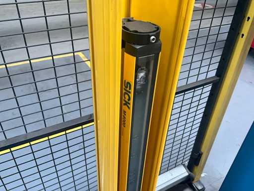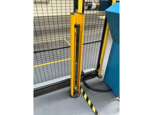 Comprend un système de rails 2x sur guide dans le sol et avec console de commande fixe +P équipée d’un écran, unité de commande +BK2 avec télécommande fixe et panneau de commande correspondant sur la machine +BK1, installation partiellement équipée d’une barrière de sécurité avec système de détection SICK composé de 2 poteaux de colonne M4000 et d’un pistolet de détection SCHMERSAL ZSD5.