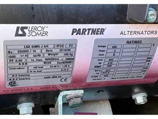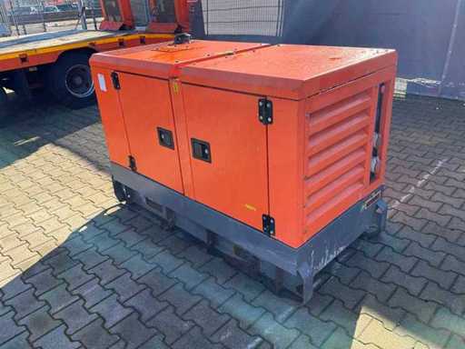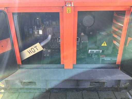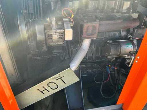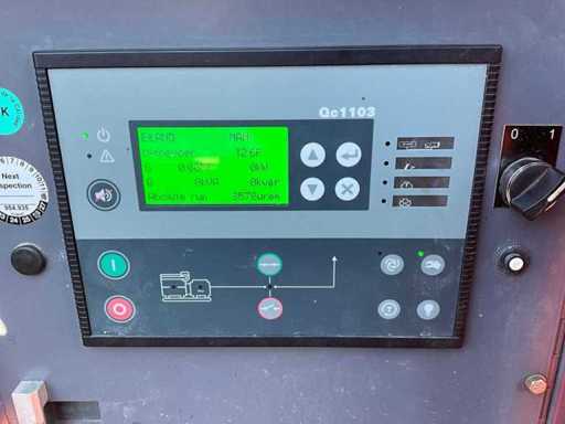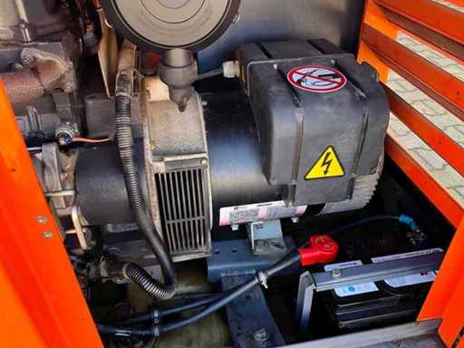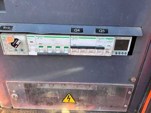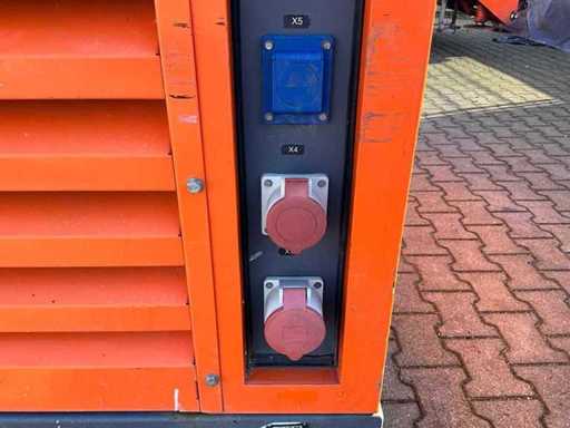 insonorisé ; connexion : 1x 230 Volts - 16 ampères ; 1x 400 volts - 16 ampères ; 1x 400 volts - 32 ampères ; capacité du réservoir de carburant de 115 litres ; connexion externe du réservoir de carburant ; consommation à charge maximale de 4,2 litres/heure ; fentes pour fourches élévateurs ; conditions de travail ;