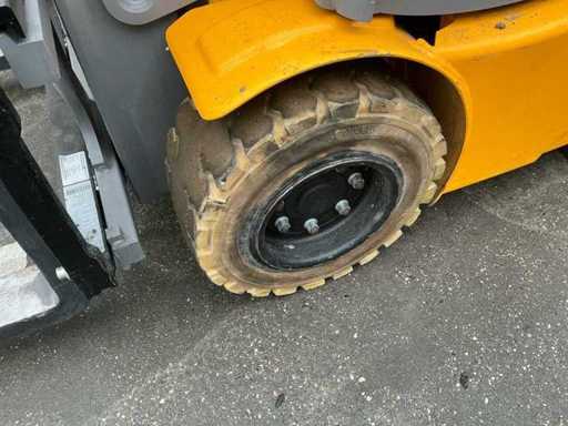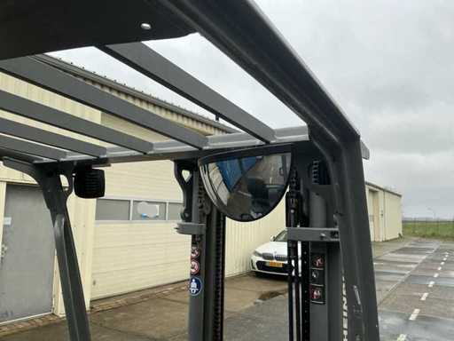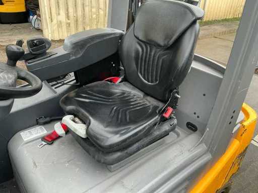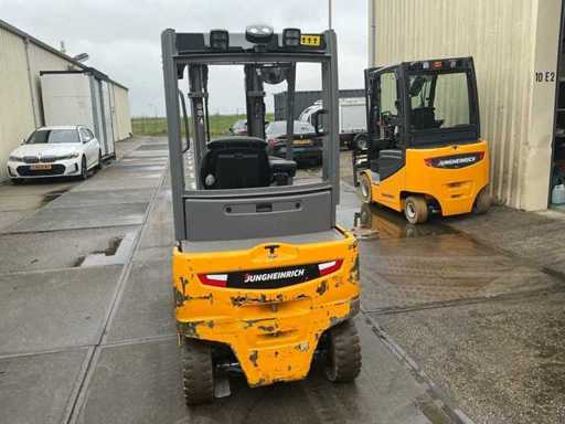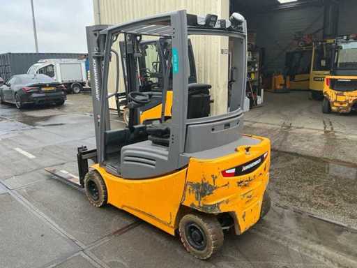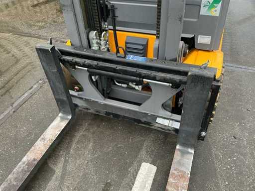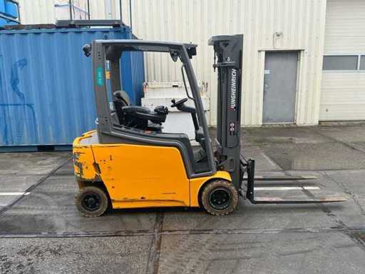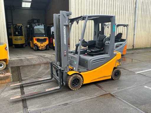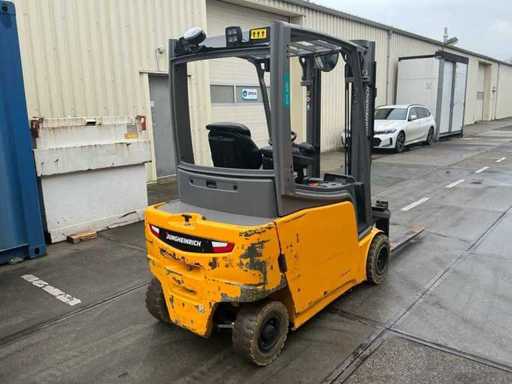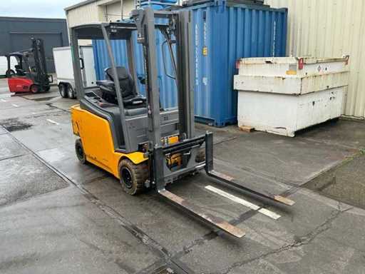 Équipé de : Le Jungheinrich EFG 320 (année de construction 2016) est un chariot élévateur électrique 48V avec une capacité de levage de 2 000 kg, une puissance nominale de 9,0 kW, un poids propre de 2 456 kg sans batterie, équipé d’une batterie 48V 6PzS 750 (750 Ah) de 1 013 kg, poids à vide total d’environ 3 469 kg, longueur standard d’environ 3,25 m fourches incluses, largeur d’environ 1,15 m, La hauteur du mât s’est rétractée d’environ 2,10 à 2,20 m, et compte 12 450 heures d’exploitation.