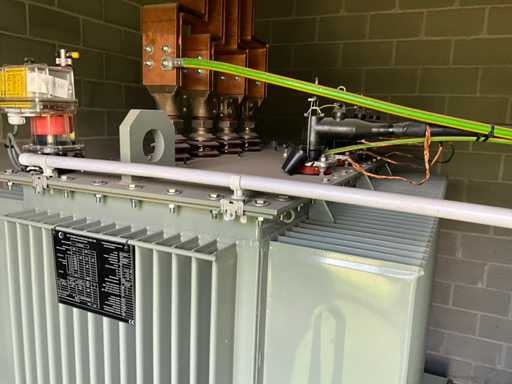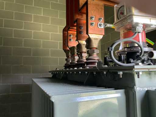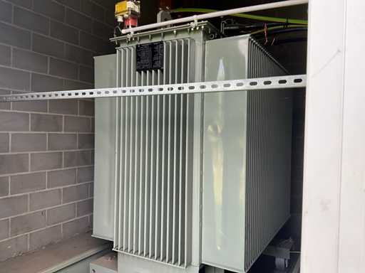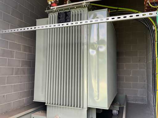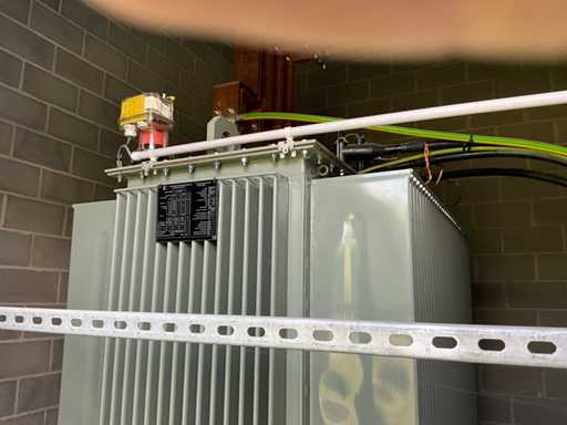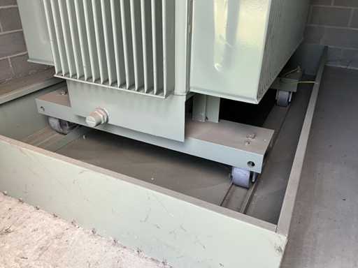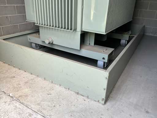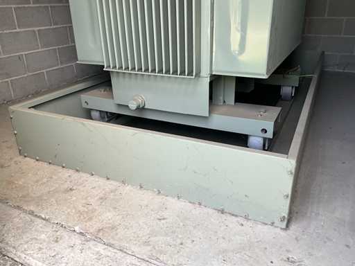 Grand transformateur lourd, mobile sur conducteurs, en version métallique et debout dans un cadre métallique d’environ 270 x 150 x 30 cm de haut.