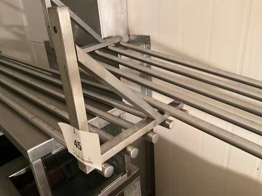 2 supports muraux en acier inoxydable dont 1 de 560 cm et 1 de 200 cm de long avec hauteur de 30 cm et profondeur 35 cm, possibilité de construction d’angle, situé dans la salle 90