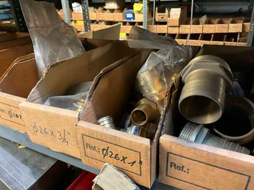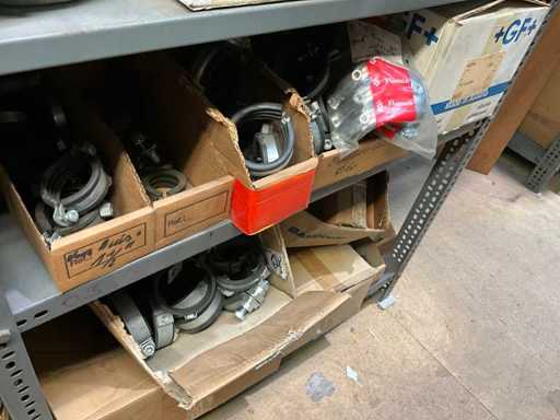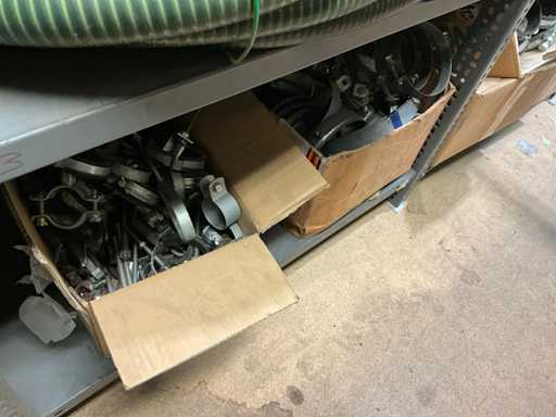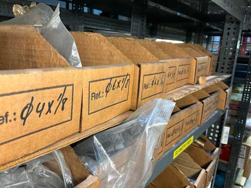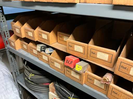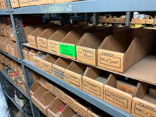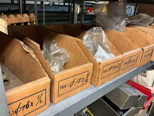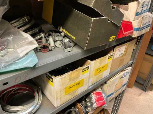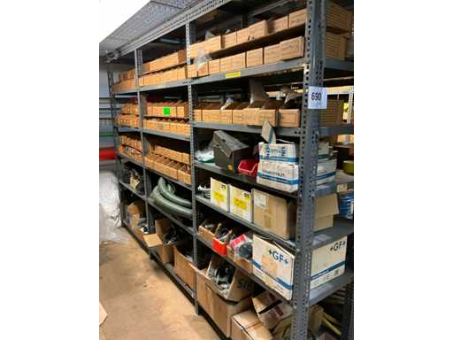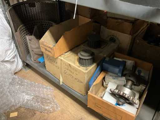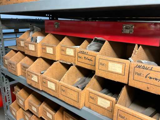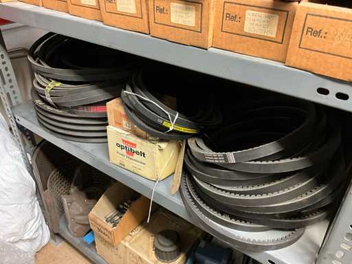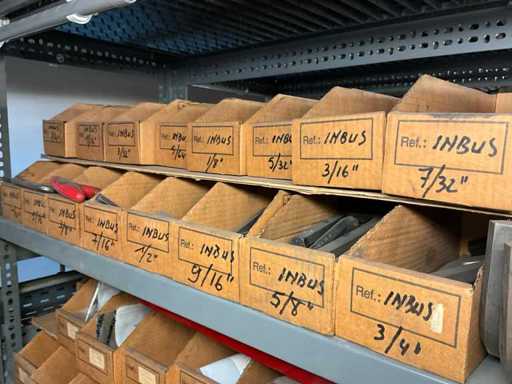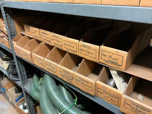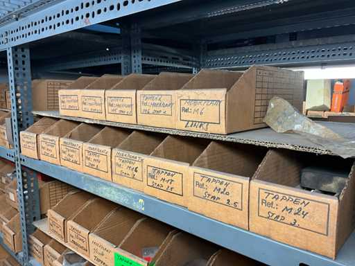 Contenu des 18 compartiments du rack d’étagères, y compris les courroies d’entraînement, les supports de montage, les accouplements, les tarauds, les tuyaux, les perceuses à métaux, les clés Allen, les supports au sol