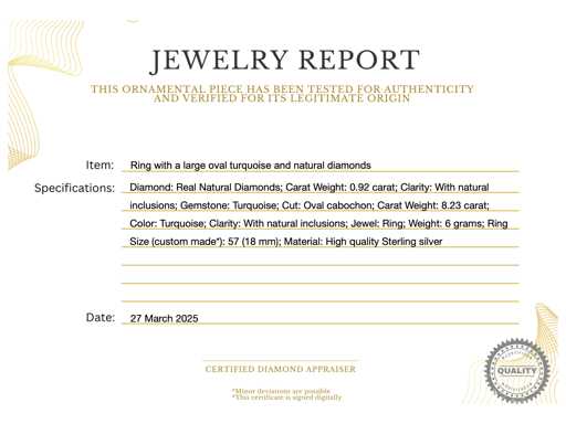 naturels Diamant : Diamants naturels authentiques ; Poids (carats) : 0,92 carat ; Pureté : Avec des inclusions naturelles ; Pierre précieuse : turquoise ; Coupe : Cabochon ovale ; Poids (carats) : 8,23 carats ; Couleur : turquoise ; Pureté : Avec des inclusions naturelles ; Joyau : Anneau ; Poids : 6 grammes ; Taille de la bague (sur mesure*) : 57 (18 mm) ; Matériau : Argent sterling de haute qualité ; État : Vintage ; Emballage : boîte à bijoux ou étui en velours ; Explication : La qualité a été prise du rapport correspondant à l’article. L’évaluation est une évaluation d’un négociant certifié en diamants, basée sur les prix à la consommation ; Informations supplémentaires : Il s’agit d’un bijou fait main ; Prix grand public : 2 355 €