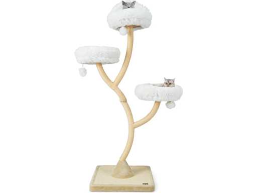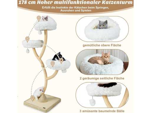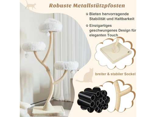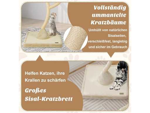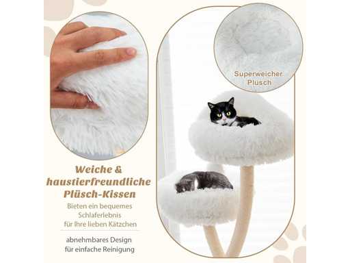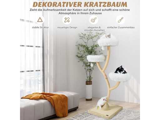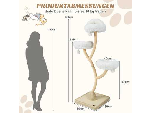 Caractéristiques techniques : Couleur : Beige Matériaux : panneau de fibres de bois, métal, peluche, corde de sisal Dimensions totales : 59 x 59 x 178 cm (L x l x H) Garde au sol de chaque niveau : 97 cm, 132 cm, 178 cm Diamètre de la surface de couchage : 40 cm Capacité de poids de chaque niveau : 10 kg Poids net : 22 kg