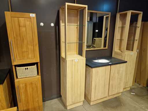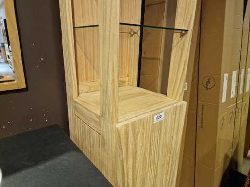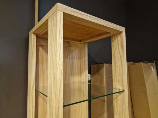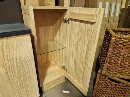 Armoire haute à colonnes en teck Dubaï avec porte battante sans poignée ouverte - étagères en verre