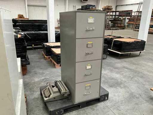Composé de 5x armoires avec 2 tiroirs, +1x classeur métallique 4 tiroirs, +1x machine à écrire