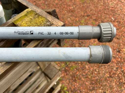 Avec les tuyaux en PVC, environ 90 pièces, diamètre de 32 mm, épaisseur de paroi de 4 mm, longueurs variant d’environ 1,45 m à 1,75 m. Inclut des connecteurs filetés collés.