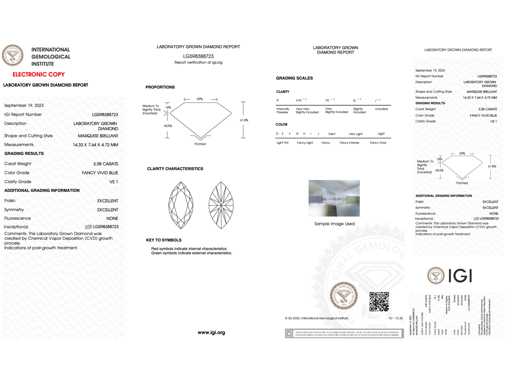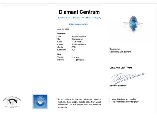 carats Diamant : Eco (cultivé en laboratoire) ; Quantité : 1 pièce ; Coupe : coupe Marquise ; Poids (carats) : 3,08 carats ; Couleur : bleu vif fantaisie ; Pureté : VS1 ; Certificat : IGI ; Numéro de certificat : LG598388723 ; Joyau : Anneau ; Poids : 4 grammes ; Taille de bague (sur mesure*) : 54 (17,25 mm) ; Matériau : or 14K (585) ; État : Neuf ; Emballage : Boîte à bijoux de luxe ; Explication : La qualité a été prise du rapport correspondant à l’article. L’évaluation est une évaluation d’un négociant certifié en diamants, basée sur les prix à la consommation ; Prix à la consommation : 13 824 €