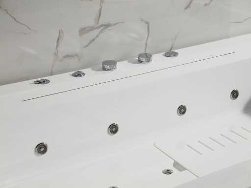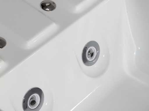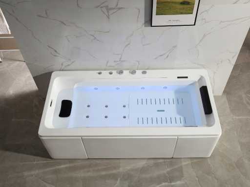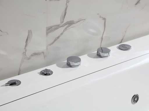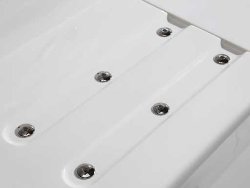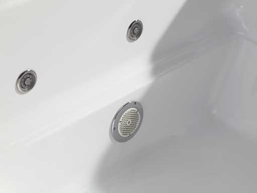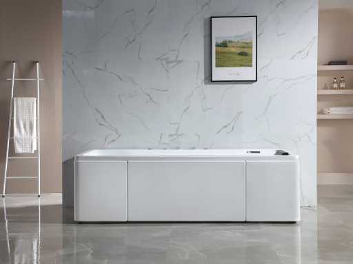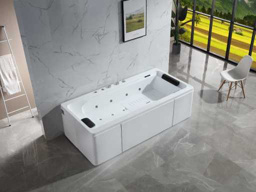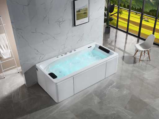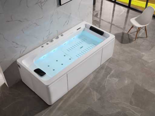 La baignoire est faite d’acrylique de 7 mm renforcée de polyester. Les robinets de bain au bord de la baignoire sont en laiton chromé.