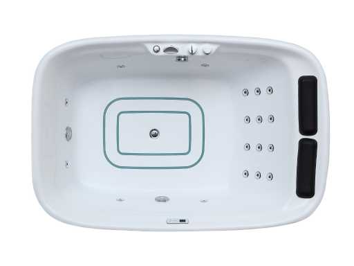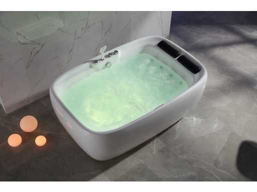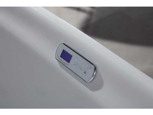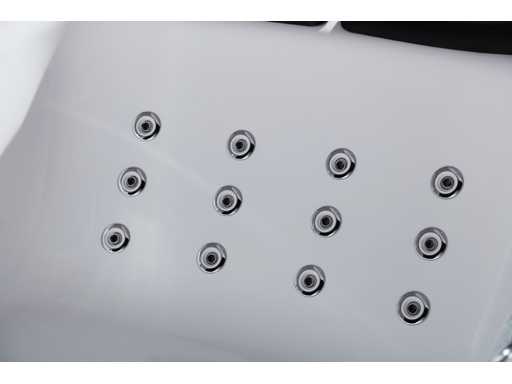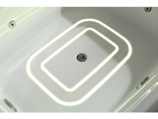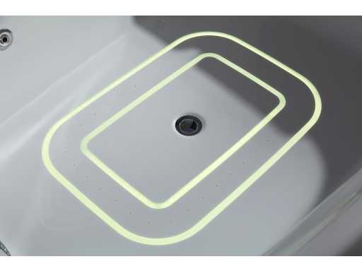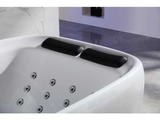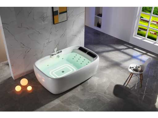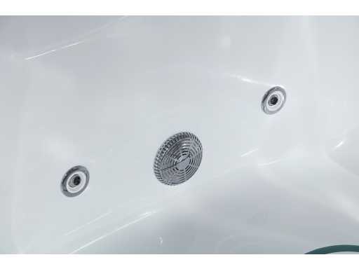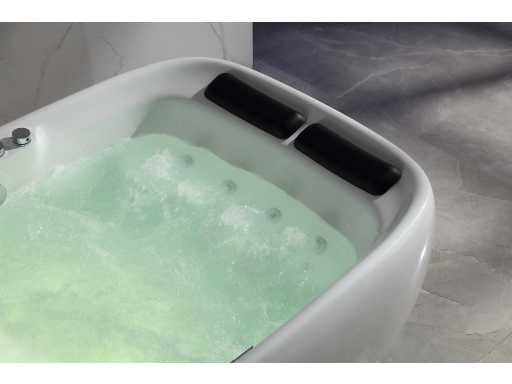 Fonctionnement : Panneau de commande numérique Vidange : escamotable avec tuyau d’eau flexible. Chauffage : oui (2000 watts). Puissance : 220v 3500 watts (avec prise plug and play). Pompe de massage : hydropompe de 1,5 ch et pompe à air de 300 watts. Jets de massage : 18 jets d’hydromassage et divers jets d’air dans le fond. Éclairage : Éclairage LED dans le sol avec luminothérapie. Caractéristiques spéciales : 2x coussins noirs moelleux, robinets en laiton chromé, y compris Bluetooth avec haut-parleurs