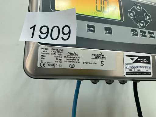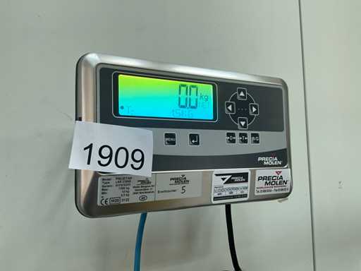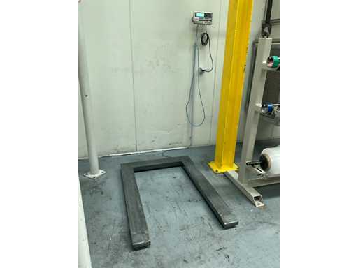 Plafond max. 1500 kg. Composé d’un élément de pesage au sol en métal en forme de U et d’un panneau de commande numérique / affichage mural, à démonter du mur par l’acheteur.