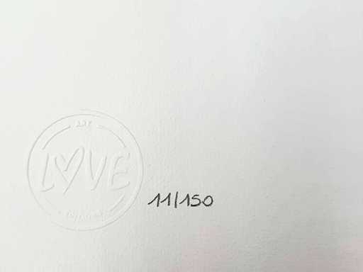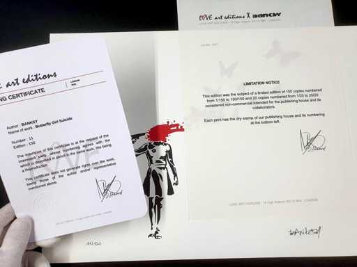 Réalisée d'après l'œuvre “Butterfly Girl Suicide" en 2021 à Londres Banksy (after) Epreuve offset sur papier d'art texturé 300 gr/m² Signée dans la planche en bas à droite Numérotée sur 150 exemplaires en bas à gauche avec tampon à sec de l'éditeur Avec certificat d'édition et le justificatif de tirage de l'éditeur Dimensions : 29 x 42cm En parfait état Provenance : Collection privée (Londres) Le numéro présenté peut varier de l'exemplaire envoyé
