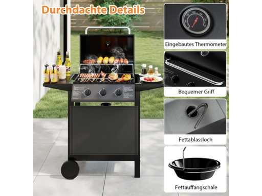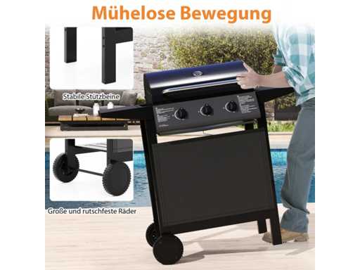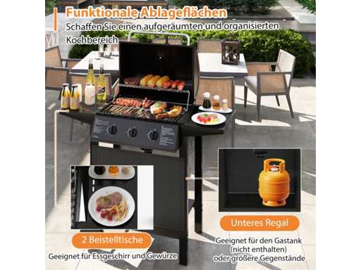 Spécifications techniques du barbecue à gaz Couleur : Noir Matériaux : Métal, tissu Oxford Dimensions hors tout : 47 x 106 x 98 cm (L x l x H) Dimensions de la table d'appoint : 36 x 27 cm (L x l) Diamètre de la roue : 15 cm Dimensions du gril de préchauffage : 651 cm². Dimensions du gril : 1608 cm². Puissance thermique totale : 24 000 BTU Poids net : 16 kg Contenu de l'emballage : 1 x barbecue à gaz 1 x Manuel d'utilisation