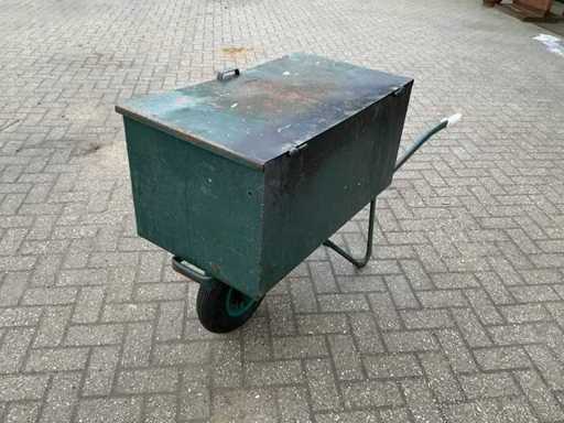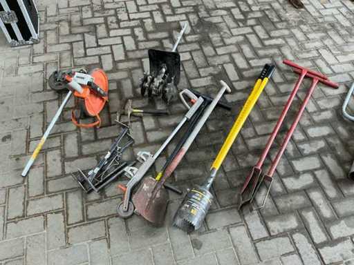 Composé de divers outils manuels, d’un chariot à main et d’une brouette à outils