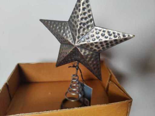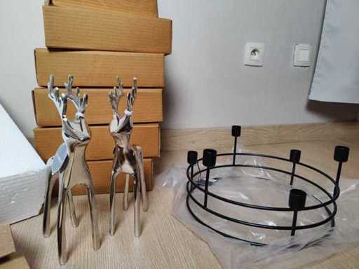 Un tapis rond sous le sapin de Noël, un chandelier de l’Avent pour les longues bougies, une décoration murale en forme d’orignal, 2 figurines chromées en forme d’orignal, 6 surmontages de sapin de Noël, 2 guirlandes de pompons