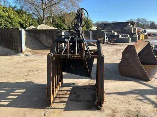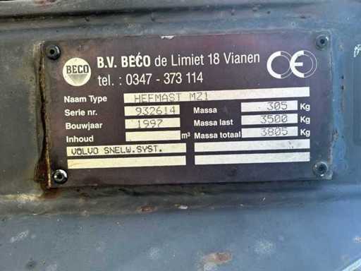 Poids maximal de levage 2500 kilos * pression de travail maximale 180 bar * équipé d’un mât de levage Beco MZ1 de 1997 avec une capacité totale de levage de 3805 kilos et un poids propre de 305 kilos * Connexion Volvo * Diamètre de la goupille 50 mm de distance centrale environ 630 mm * Fonction de rotation contrôlée électroniquement (peut être reconvertie en 4e fonction hydraulique directe)