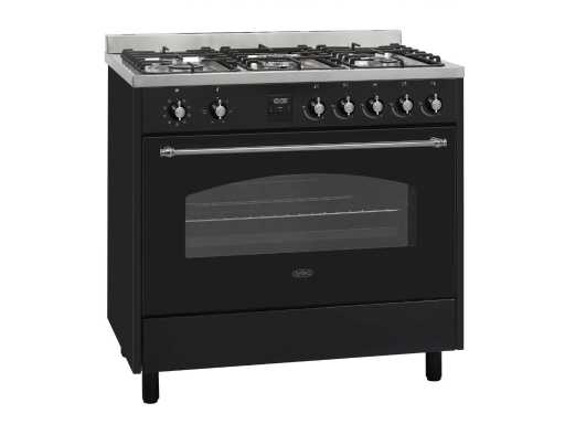 Cuisinière ; gaz ; 90 cm ; noir ; 5 brûleurs ; grilles en fonte ; aut. inflammation ; Fenêtre courbe (rétro)
