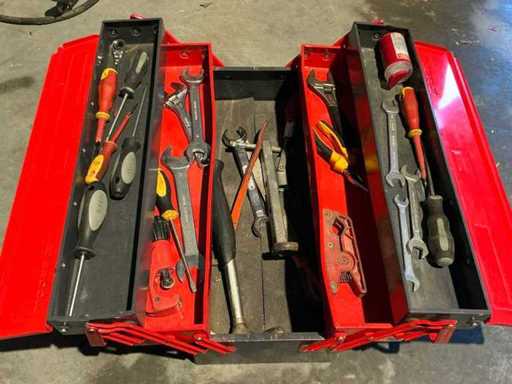 Contenant quelques outils manuels divers tels que tournevis, clés à clé, 1 marteau et 1 pince