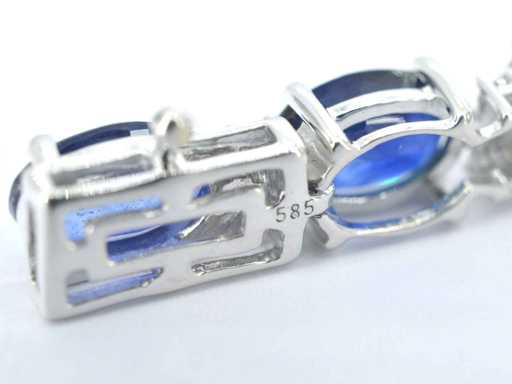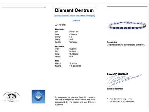 saphir Diamant : Naturel ; Coupe : Coupe brillante ; Poids (carats) : 0,50 carat ; Couleur : F-G ; Pureté : SI-P ; Qualité de la coupe : Très jolie ; Pierre précieuse : Saphir ; Coupe : Ovale ; Poids (carats) : 15,00 carats ; Couleur : saphir ; Pureté : Avec des inclusions naturelles ; Coupe : Très bien ; Bijou : Bracelet ; Poids : 10 grammes ; Dimensions/longueur : 18 cm ; Matériau : or 14 carats (585) ; État : Neuf ; Emballage : Boîte à bijoux de luxe ; Explication : La qualité a été prise du rapport correspondant à l’article. L’évaluation est une évaluation d’un négociant certifié en diamants, basée sur les prix à la consommation ; Prix à la consommation : 6 230 €