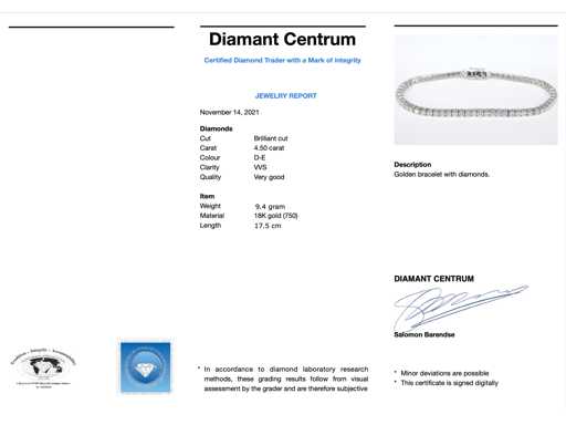 carats Diamant : naturel ; Quantité : 64 pièces ; Coupe : Coupe brillante ; Poids (carat) : 4,50 carats ; Couleur : D-E ; Pureté : VVS-CONTRE ; Qualité de la coupe : Très jolie ; Bijou : Bracelet ; Poids : 9,4 onces ; Dimensions/longueur : 17,5 cm (personnalisable) ; Matériau : or 18K (750) ; État : Neuf ; Emballage : Boîte à bijoux de luxe ; Explication : La qualité a été prise du rapport correspondant à l’article. L’évaluation est une évaluation d’un négociant certifié en diamants, basée sur les prix à la consommation ; Prix à la consommation : 26 640 €