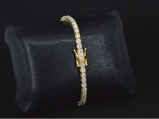 Pierre précieuse : moissanite ; Coupe : Coupe brillante ; Poids (carats) : 11,00 carats ; Couleur : E-F ; Pureté : VVS ; Qualité de la coupe : Très jolie ; Bijou : Bracelet ; Marque : Harmony ; Poids : 12 grammes ; Dimensions/longueur : 18 cm ; Matériau : Vermeil en argent sterling de haute qualité (925) ; État : Neuf ; Emballage : boîte à bijoux ou étui en velours ; Explication : La qualité a été prise du rapport correspondant à l’article. L’évaluation est une évaluation d’un négociant certifié en diamants, basée sur les prix à la consommation ; Informations supplémentaires : Le poids mesuré des pierres précieuses est basé sur la taille des diamants ; Prix à la consommation : 1 600 €