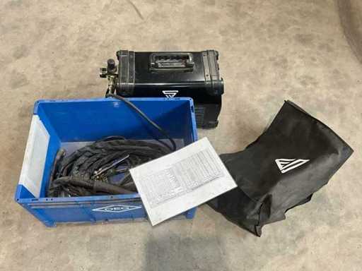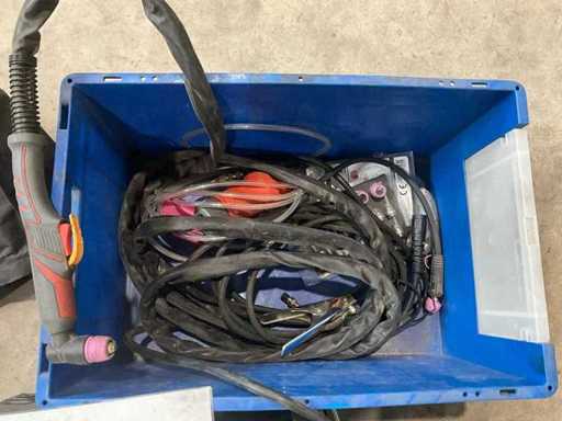 Brûleur plasma (chalumeau), pince de terre, tuyaux et câbles, régulateur de pression / filtre à air, boîte de rangement avec accessoires, couvercle de protection