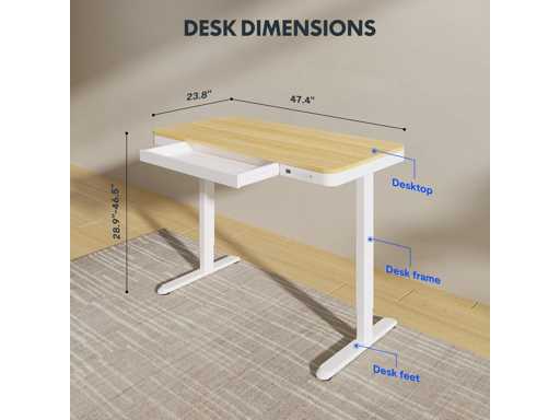 Fonctions multiples intégrées : Enregistrez facilement plusieurs réglages grâce aux quatre hauteurs préréglées programmables. Chargez deux appareils simultanément via les ports USB intégrés, sans encombrement ni tracas. (Remarque : la charge peut être interrompue lors du réglage de la hauteur du bureau. La charge d’un ordinateur portable est également prise en charge.)