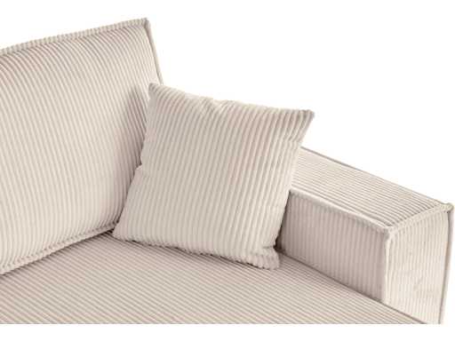 Canapé recouvert de velours côtelé doux, orné de passepoils élégants et doté de poches latérales pour un rangement pratique.
