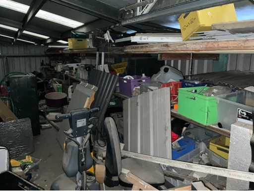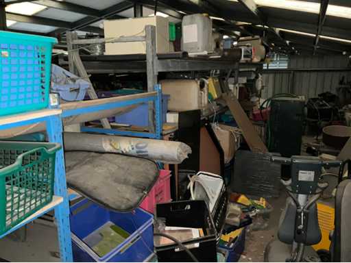 Composé de rayonnages à palettes avec du contenu comprenant des lampes, des outils à main électriques, des attaches, une pelle Limpia, etc.