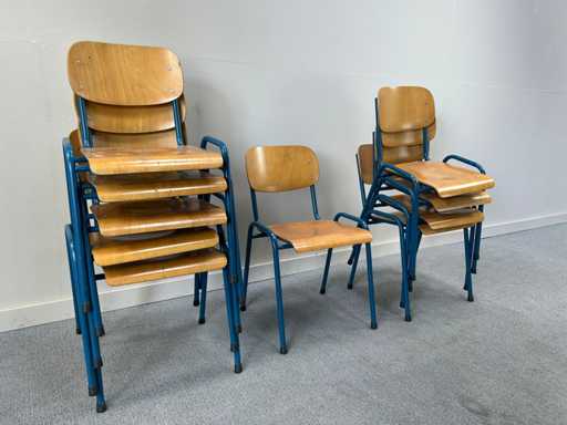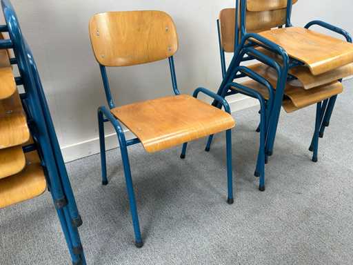 Un ensemble de 10 chaises d’école en bois empilables, bases en métal bleu. Avec des signes d’usure, l’état peut varier d’un article à l’autre.