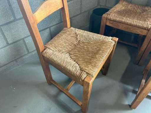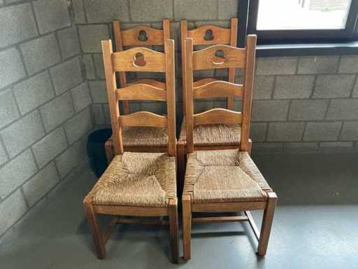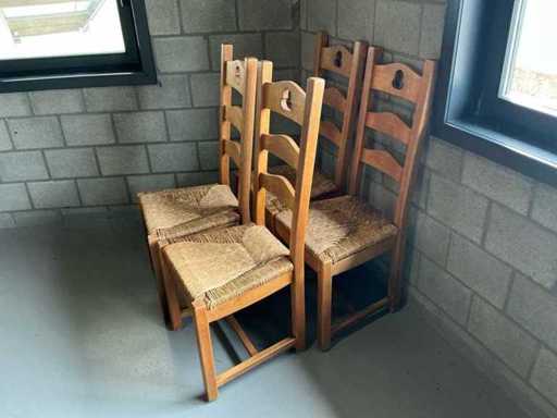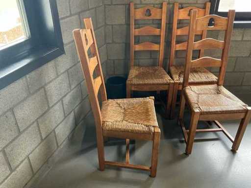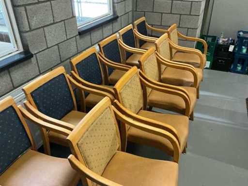Comprend : 11 pièces de chaises en bois, siège en vinyle, dossier tissu couleur beige, 8 pièces avec sellerie bleue sur le dossier.