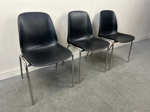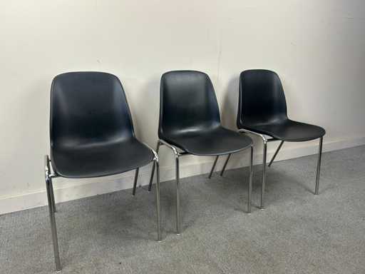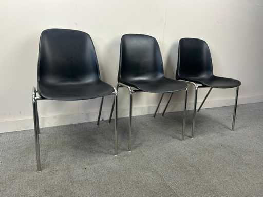 Ensemble de 10 sièges baquets empilables en plastique noir. En bon état, quelques signes d’usure apparaissent.