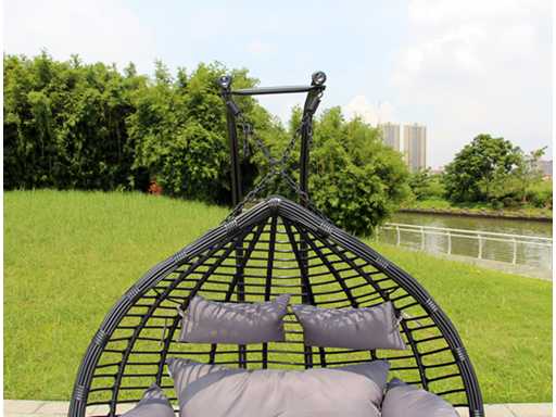 Type : SWING-81-D. Couleur : Cadre noir / coussins gris. Dimensions : panier : A135*H125*D78 cm, perche : H197 cm, Base : 105 cm