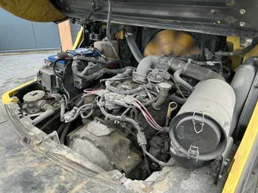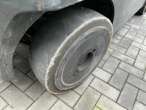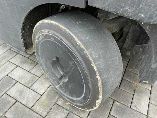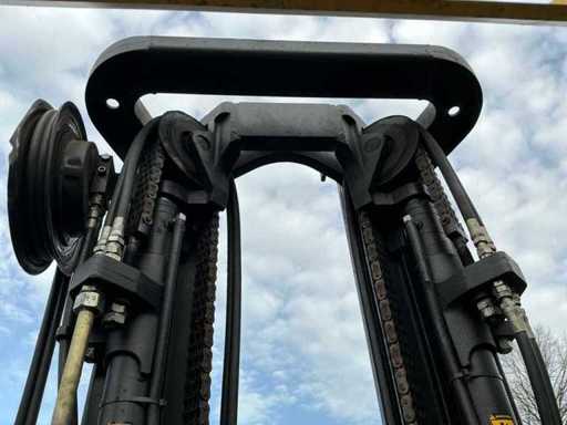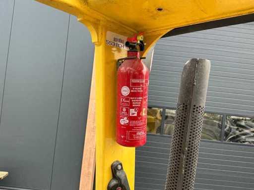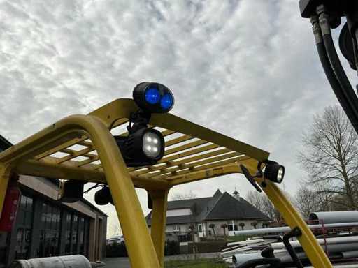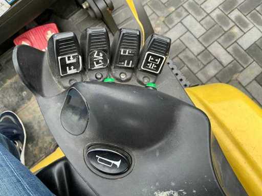 Équipé de : fourches hydrauliques réglables, mât triplici, pneus pleins, balise, feux de travail, feux de sécurité